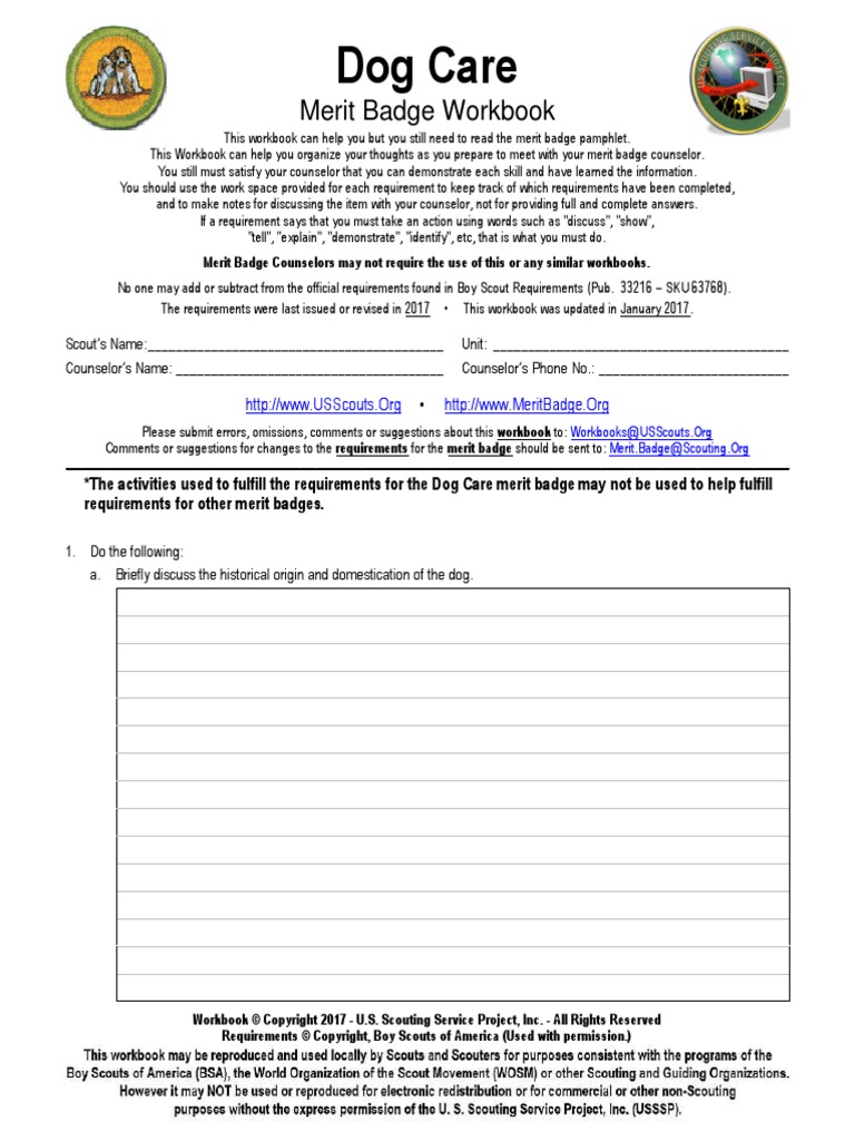Merit badge counselors may not require the use of this or any similar workbooks. Requirements for the dog care merit badge: District and council advancement committees are encouraged to offer opportunities for scouts to work on at least some of these merit badges at resident camp, at camporees, or during special anniversary. Briefly discuss the historical origin and domestication of the dog. The following is a summary of the dog care merit badge, ranging from dog breeds and characteristics, caring for the dogs, etc.